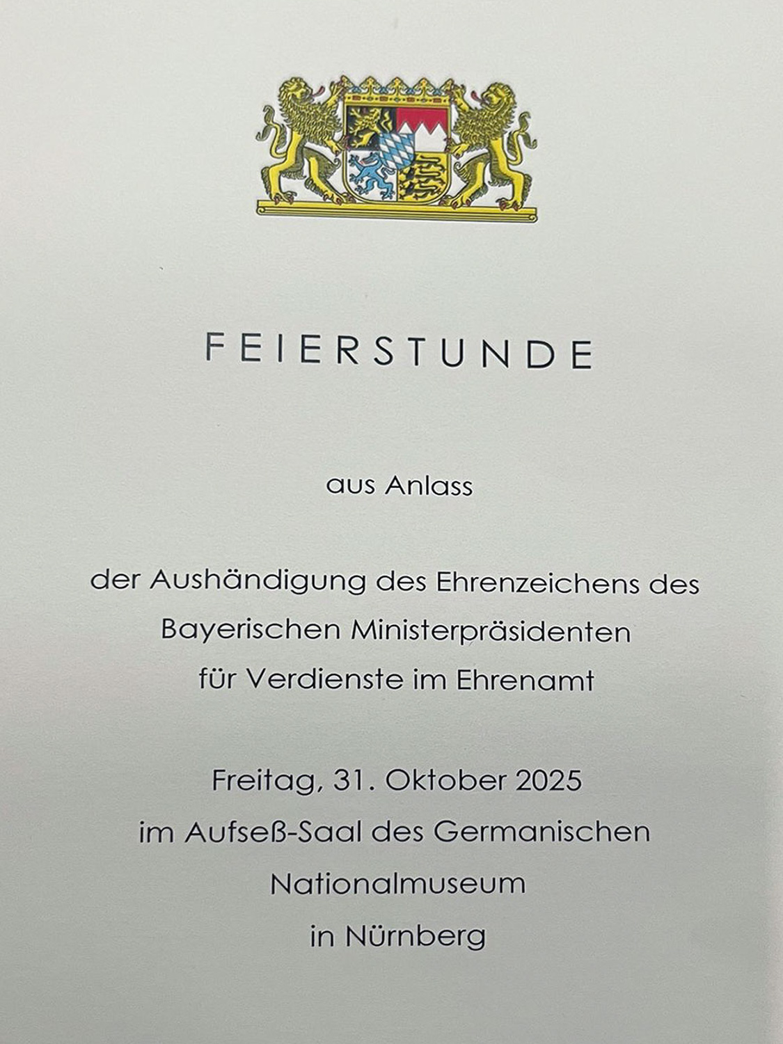 Ehrenzeichen für unseren Vorsitzenden Gerhard Stadler Franz2025-11-02T11:01:50+01:002. November 2025|keine Zuordnung|1 Kommentar Unser Vorsitzenden Gerhard erhielt am Freitag, 31.10.2025 in Nürnberg das „Ehrenzeichen des Bayerischen Ministerpräsidenten für Verdienste im Ehrenamt „ Der Fanclub und seine Mitglieder gratulieren recht herzlich! Sorry, your browser doesn't support embedded videos. Ein Kommentar Franz R. 2. November 2025 um 12:15 Uhr - Antworten Auch ich gratuliere zu dieser Auszeichnung! Nicht viele erhalten das Ehrenzeichen des bay. Ministerpräsidenten. 🎔 Hinterlasse einen Kommentar Antwort abbrechenKommentar Meinen Namen, E-Mail und Website in diesem Browser speichern, bis ich wieder kommentiere.